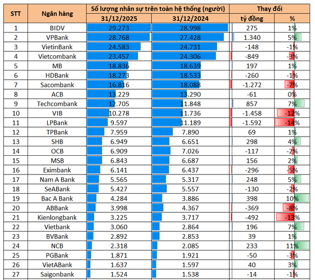 Trong đó, có tổng cộng 14 ngân hàng giảm quy mô nhân sự trong năm 2025 và 13 ngân hàng mở rộng.