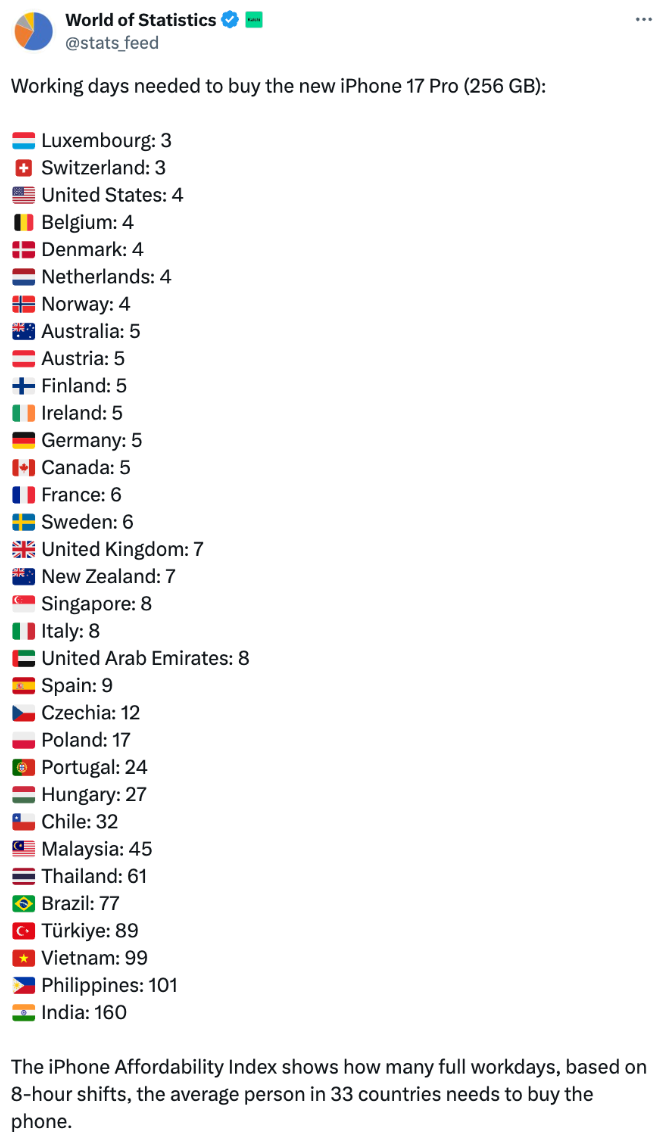 Theo World of Statistics, người Việt cần trung bình 99 ngày công để mua iPhone 17 Pro bản 256GB, trong khi người Mỹ chỉ mất 4 ngày, người Anh 7 ngày và Singapore 8 ngày. Trên thực tế theo báo cáo của Tổng cục Thống kê trong 6 tháng đầu năm 2025, với mức thu nhập bình quân khoảng 8,3 triệu đồng/tháng, giá iPhone 17 Pro (34,99 triệu đồng) tương đương hơn 127 ngày làm việc nếu trả thẳng.