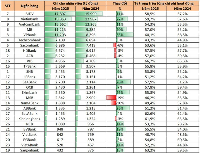 Nhìn tổng thể, năm 2025 cho thấy xu hướng gia tăng chi phí nhân sự tại nhiều ngân hàng, đặc biệt là nhóm ngân hàng lớn và ngân hàng đang mở rộng mạnh hoạt động bán lẻ và ngân hàng số. Trong bối cảnh cạnh tranh ngày càng gay gắt, đầu tư cho con người tiếp tục được xem là yếu tố then chốt giúp các ngân hàng nâng cao năng lực cạnh tranh và duy trì tăng trưởng trong những năm tới.