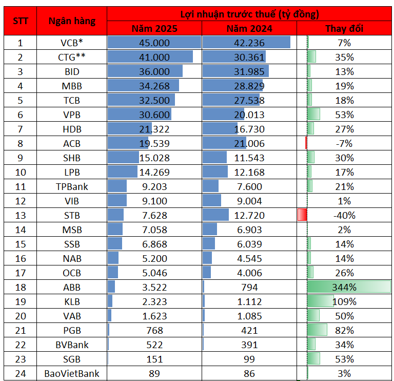 Tính đến chiều 30/1, đã có 25 ngân hàng công bố kết quả kinh doanh năm 2025 là Vietcombank, VietinBank, BIDV, MB, Techcombank, VPBank, LPBank, Sacombank, Nam A Bank, Kienlongbank, ABBank, PGBank, BAOVIET Bank, VietABank, SeABank, ACB, Saigonbank, BVBank, VIB, HDBank, SHB, TPBank, MSB, OCB và NCB.