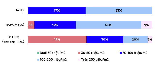 Cơ cấu giá cho thấy hơn 50% nguồn cung mới tại cả hai thị trường đều trên 100 triệu đồng/m². Đặc biệt tại khu Tây Hà Nội, các dự án lần đầu mở bán có mức giá từ 104 triệu/m2. Tại TP.HCM sau sáp nhập có biên độ giá rộng hơn, 30 – 200 triệu đồng/m², song các căn hộ tầm trung chủ yếu nằm ở Bình Dương; khu trung tâm vẫn ghi nhận mặt bằng giá cao nhất thị trường.
