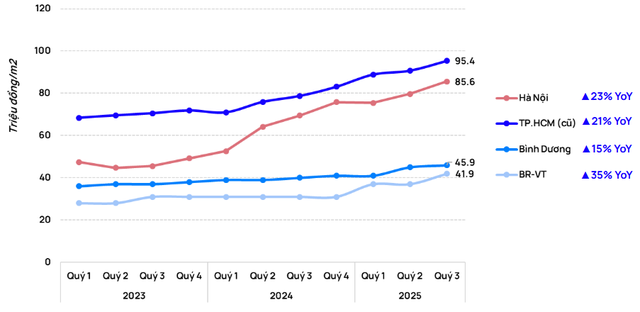 Giá căn hộ trung bình tại cả hai đô thị lớn tiếp tục tăng mạnh, đều trên 20% so với cùng kỳ năm ngoái. Cụ thể tại Hà Nội, giá trung bình đạt 85,6 triệu đồng/m², tăng 23% , còn TP.HCM (cũ) ở mức 95,4 triệu đồng/m², tăng 21% so với cùng kỳ. Riêng các dự án mở mới trong quý 3/2025 đã tiệm cận 108 – 131 triệu đồng/m², phản ánh rõ xu hướng ở nhóm sản phẩm cao cấp.
