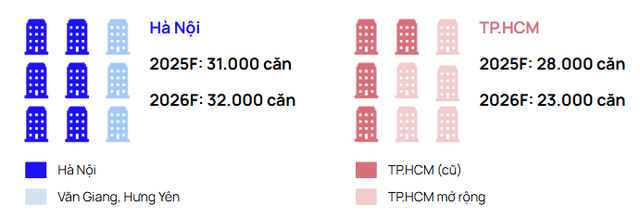 Dự báo của One Mount Group cho thấy năm 2025, nguồn cung sơ cấp tại Hà Nội sẽ đạt khoảng 31.000 căn, cao nhất trong vòng ba năm, trong khi TP.HCM dự kiến đạt 28.000 căn. Sang năm 2026, nguồn cung lần lượt duy trì ở mức 32.000 căn tại Hà Nội và 23.000 căn tại TP.HCM.