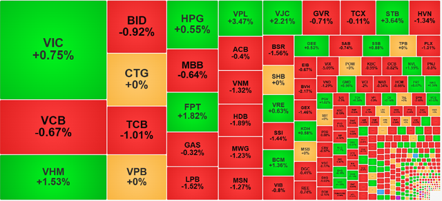 Hàng loạt trụ của nhóm ngân hàng mất điểm như: VCB giảm 0,67%, TCB giảm 1,01%, BID giảm 0,92%, HDB giảm 1,89%, LPB giảm 1,52%.
