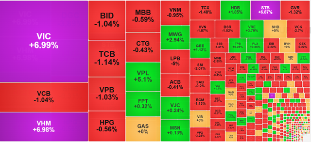 Nhóm cổ phiếu Vingroup là động lực chính của thị trường khi VIC và VHM tăng kịch trần lên lần lượt tại 169.900 đồng/cổ phiếu và 141.900 đồng/cổ phiếu. Còn lại VRE +3,8% lên 34.250 đồng/cổ phiếu và VPL +5,1% lên 103.000 đồng/cổ phiếu. Nhóm 4 cổ phiếu này đã hỗ trợ tới hơn 30 điểm cho VN-Index.