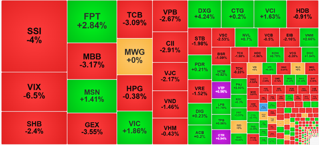 Nhóm ngân hàng với TCB giảm 3,09%, VPB giảm 2,67%, MBB giảm 3,17%.