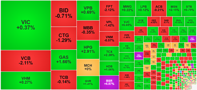 Trong khi đó, nhóm cổ phiếu ngân hàng lại nghiêng về sắc đỏ: VCB giảm 2,11%, SHB giảm 1,58%, CTG giảm 1,29%; MBB, ACB, BID, TCB, VIB giảm gần 1%...