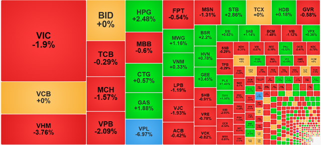 Bên cạnh đó còn có LPB (-1,2%), MSN (-1,3%), BCM (-1,3%), VJC (-1,9%), VPB (-2,1%) và DGC (-5,7%).