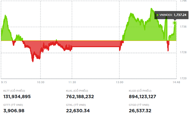 Phiên 4/12, VN-Index tăng 5,47 điểm (0,32%) lên 1.737,24 điểm với 217 mã tăng, 91 mã giảm và 65 mã đứng giá.