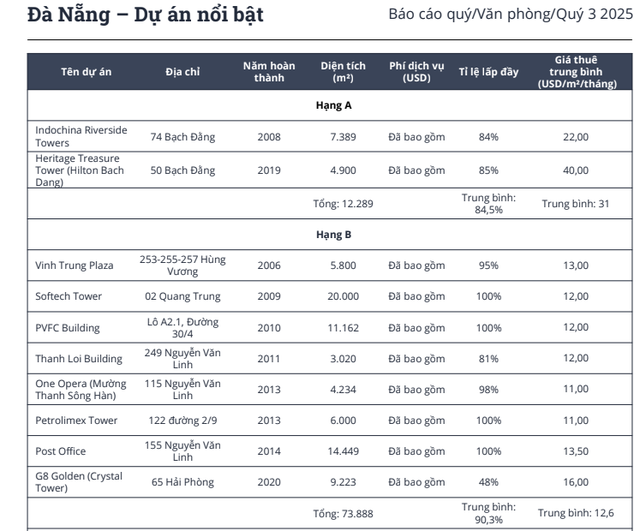 Báo cáo từ thị trường bất động sản Đà Nẵng quý 3/2025 của Avison Young cho biết, tỷ lệ lấp đầy văn phòng hạng A và B đạt lần lượt 84% và 89%, giá thuê trung bình phân khúc hạng A duy trì quanh mức 31 USD/m2/tháng. Trong khi đó, nguồn cung mới ra thị trường không nhiều, chủ yếu đến từ các dự án tái cấu trúc hoặc tổ hợp thương mại lớn.