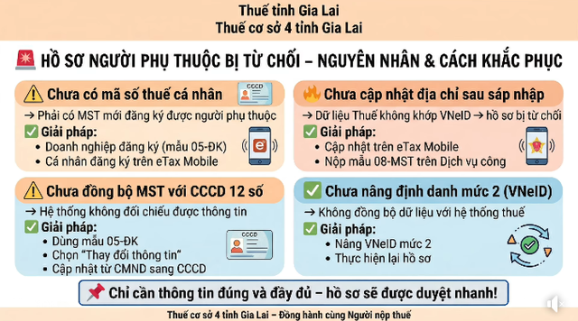 Thuế cơ sở 4 tỉnh Gia Lai cho cho biết, điều này chủ yếu xuất phát từ 4 lỗi chính, gồm: chưa có mã số thuế, sai địa chỉ sau sáp nhập, chưa cập nhật căn cước công dân, chưa nâng VNeID mức 2. Chỉ cần xử lý đúng và nộp lại, hồ sơ sẽ nhanh chóng được duyệt.
