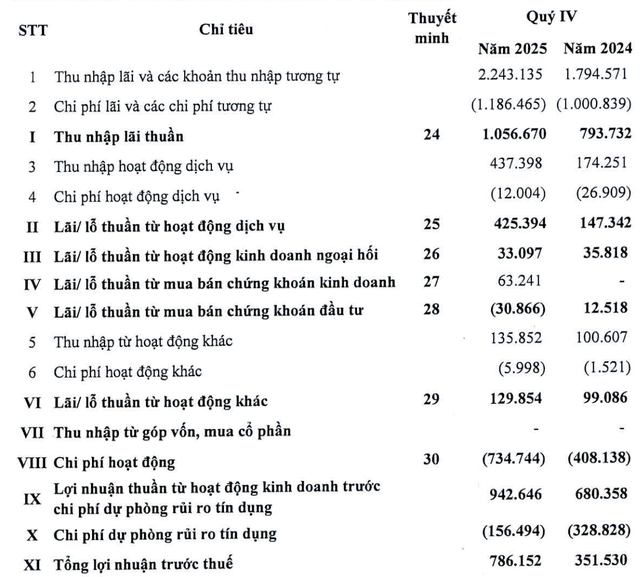 Động lực lớn nhất đến từ thu nhập lãi thuần, đạt 16.767 tỷ đồng trong quý 4/2025, tăng khoảng 27% so với cùng kỳ.
