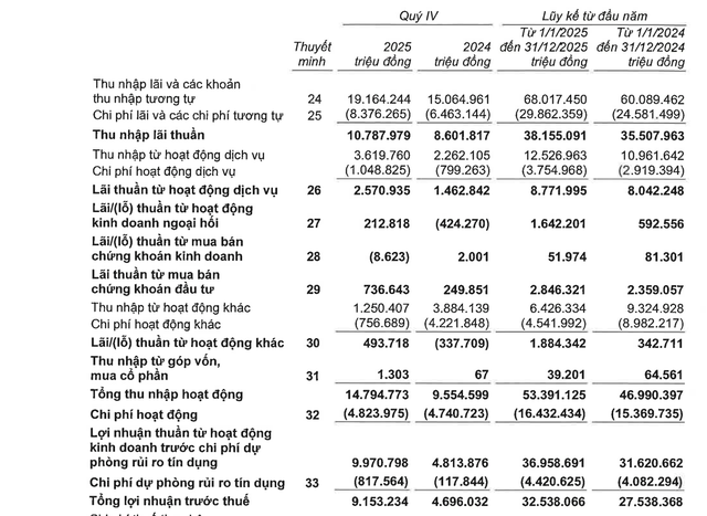 Trong quý 4/2025, VPBank ghi nhận mức tăng trưởng lợi nhuận ấn tượng, phản ánh sự cải thiện rõ rệt cả về thu nhập cốt lõi lẫn khả năng kiểm soát rủi ro. Ngân hàng báo lợi nhuận trước thuế đạt 10.229 tỷ đồng, tăng mạnh so với mức 6.151 tỷ đồng của cùng kỳ năm trước, tương ứng mức tăng gần 66%.