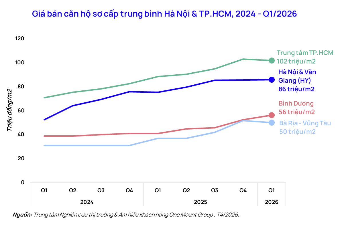 Giá trung bình tại Trung tâm TP.HCM đạt khoảng 102 triệu đồng/m², trong khi Hà Nội đạt khoảng 86 triệu đồng/m². Tuy nhiên, bên trong bức tranh chung là sự phân hóa rõ rệt giữa các khu vực.