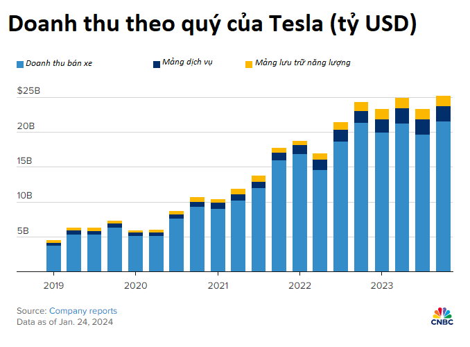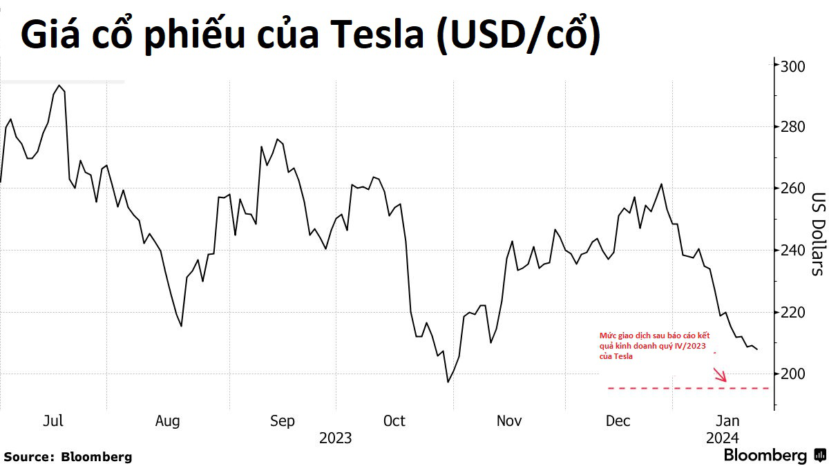 Báo cáo quý IV/2023 cho thấy doanh thu của Tesla chỉ tăng 3% so với cùng kỳ năm trước, đạt 24,3 tỷ USD và thấp hơn so với mức dự báo 25,6 tỷ USD, qua đó khiến giá cổ phiếu giảm 6%, tương đương hàng chục tỷ USD vốn hóa, ngay trong phiên giao dịch.