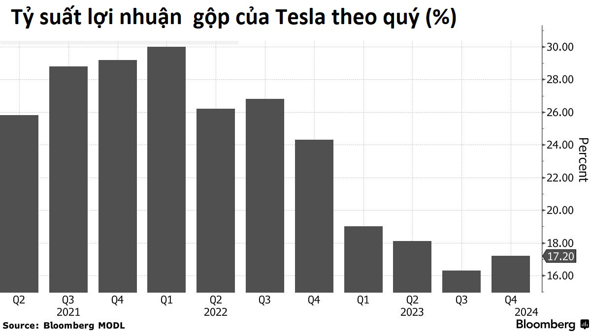 Tỷ suất lợi nhuận từ hoạt động kinh doanh của Tesla chỉ tăng 8%, thấp hơn mức 16% cùng kỳ năm 2022 và chỉ cao hơn một chút so với 7,6% của quý III/2023. Tỷ suất lợi nhuận gộp của hãng chỉ đạt 17,2% trong quý IV/2023, thấp hơn nhiều so với những quý trước đây.