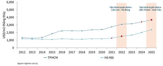 Bà Phan Thị Ánh Đào, Trưởng phòng Cấp cao, Bộ phận Tư vấn và Nghiên cứu JLL Việt Nam cho hay, theo báo cáo của JLL Việt Nam, các dự án nằm trong phạm vi 10 phút đi bộ từ nhà ga metro hiện chiếm 14-16% tổng nguồn cung bất động sản thương mại và 4-9% nguồn cung nhà ở ở cả hai thị trường. Con số này cho thấy tầm quan trọng ngày càng tăng của các dự án có liên quan đến hệ thống giao thông công cộng trong tổng thể nguồn cung bất động sản của hai thành phố lớn nhất Việt Nam.