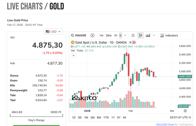 Thị trường kim loại quý đầu năm Bính Ngọ 2026 ghi nhận biến động mạnh khi giá vàng thế giới bất ngờ giảm sâu. Ghi nhận lúc 8h (theo giờ Việt Nam), giá vàng thế giới giao ngay dao động quanh mức 4.880 USD/ounce, đi ngang so với mức đóng cửa hôm qua. Trước đó, giá vàng đã giảm gần 2,3% trong phiên giao dịch 17/2 (tức mùng 1 Tết Nguyên đán).