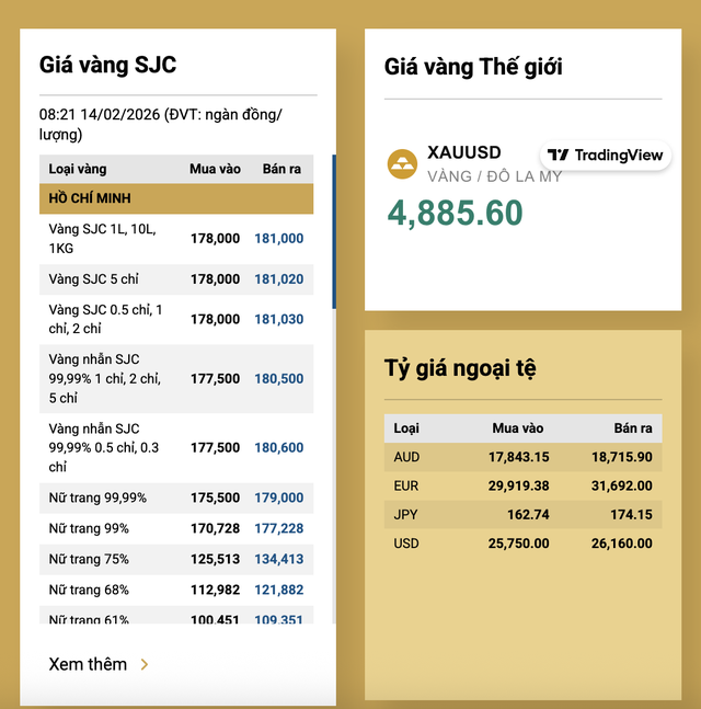 Chốt phiên giao dịch cuối cùng trước kỳ nghỉ Tết, giá vàng trong nước duy trì ở vùng cao. Cụ thể, vàng miếng tại SJC và PNJ cùng được niêm yết ở mức 178 – 181 triệu đồng/lượng (mua vào – bán ra). Bảo Tín Minh Châu và Bảo Tín Mạnh Hải cũng chào mua - bán vàng miếng ở cùng mặt bằng giá 178 – 181 triệu đồng/lượng, cho thấy sự đồng thuận rõ rệt giữa các thương hiệu trước kỳ nghỉ dài ngày.