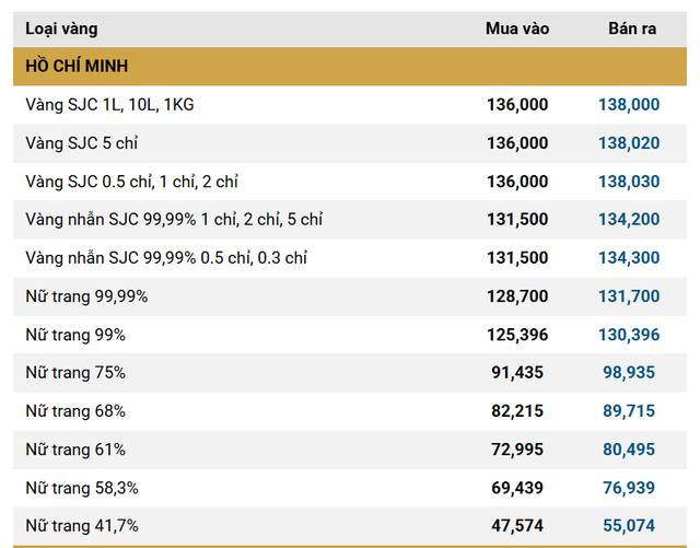 Hiện giá bán vàng SJC phổ biến ở mức 138 triệu đồng/lượng, trong khi vàng nhẫn là 135 triệu đồng/lượng.