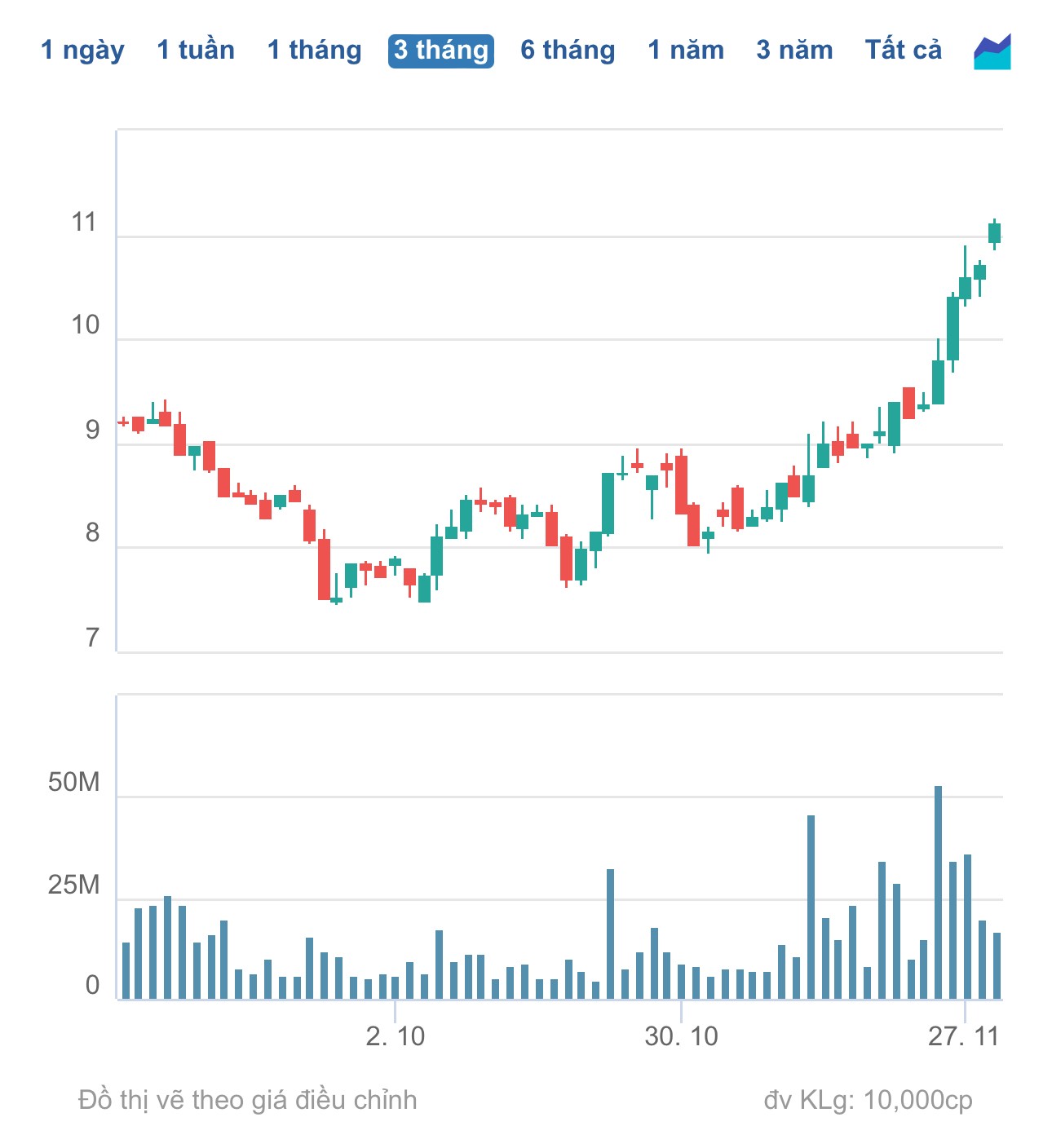 Kết thúc phiên giao dịch sáng ngày 29/11, cổ phiếu HAG đã tăng 3,7% lên mức 11.100 đồng. Đây đa là phiên tăng thứ 6 liên tiếp của cổ phiếu này. Nhìn xa hơn, thị giá của HAG đã tăng 48% kể từ cuối tháng 9 tới nay.
