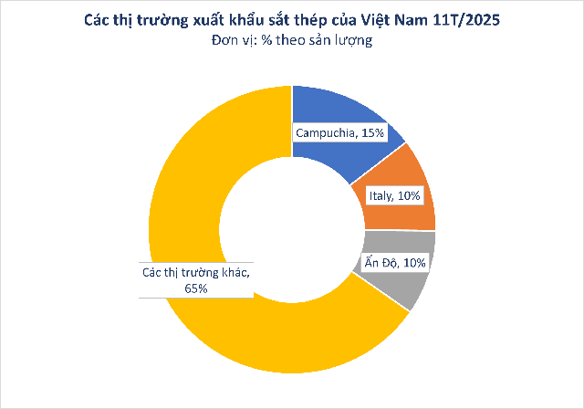 Dù thị trường chung giảm nhưng một số thị trường vẫn duy trì mức tăng. Cụ thể, Campuchia đang là thị trường xuất khẩu lớn nhất của sắt thép Việt Nam với hơn 1,3 triệu tấn, trị giá hơn 768 triệu USD, tăng 24% về lượng và tăng 14% về trị giá so với cùng kỳ năm 2024. Giá xuất khẩu bình quân 571 USD/tấn, giảm gần 8% so với cùng kỳ năm trước.