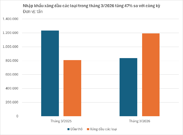 Tính chung trong 3 tháng đầu năm, tổng lượng nhập khẩu dầu thô và xăng dầu các loại đạt gần 6,49 triệu tấn, với kim ngạch khoảng 4,59 tỷ USD. So với cùng kỳ năm 2025, sản lượng tăng nhẹ gần 8%, trong khi giá trị tăng gần 20%.