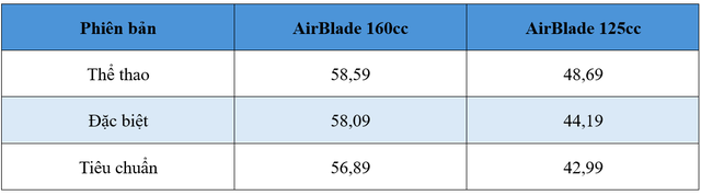 Air Blade 160cc có giá từ 56,89 triệu đồng đến 58,59 triệu đồng. Trong khi phiên bản 125cc có giá 42,99-48,69 triệu đồng.Xe Honda cho biết các mẫu xe được bán ra từ ngày 15/11.