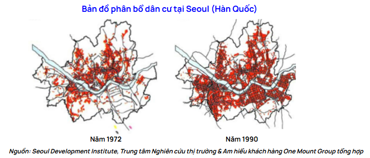Tương tự, tại Seoul (Hàn Quốc), quá trình mở rộng đô thị về phía Nam sông Hàn từ thập niên 1970 đã hình thành những trung tâm phát triển mới như Gangnam, nơi tập trung các công trình biểu tượng, trung tâm thương mại và khu dân cư cao cấp.
