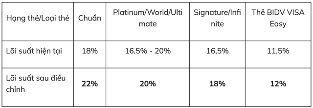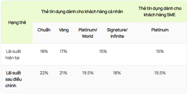 Cụ thể, đối với thẻ tín dụng dành cho khách hàng cá nhân, lãi suất thẻ tín dụng hạng chuẩn tăng từ 18%/năm lên 22%/năm; hạng vàng tăng từ 17%/năm lên 21%/năm. Các hạng thẻ Platinum/Word và thẻ hạng Signature/Infinite lần lượt tăng từ 15% lên 19,5%/năm và 18%/năm.