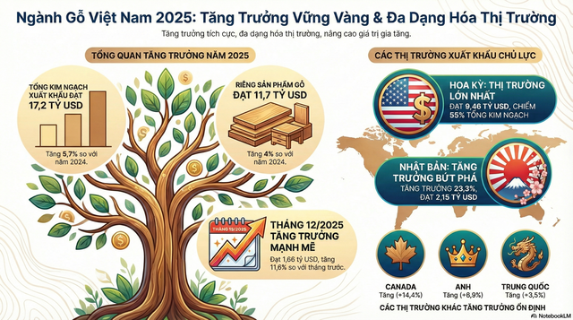 Theo số liệu thống kê từ Cục Hải quan Việt Nam, trị giá xuất khẩu gỗ và sản phẩm gỗ trong tháng 12/2025 đạt 1,66 tỷ USD, tăng 6% so với tháng 12/2024. Cả năm 2025, trị giá xuất khẩu gỗ và sản phẩm gỗ đạt hơn 17 tỷ USD, tăng 5,7% so với năm 2024 và là mức cao nhất từ trước tới nay.