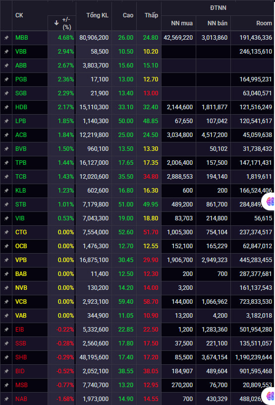 Ở chiều ngược lại, chỉ có số ít cổ phiếu ngân hàng giảm giá — như EIB, SSB, SHB, BID, MSB, NAB — nhưng mức giảm đều khá nhẹ, chủ yếu dưới 1%.