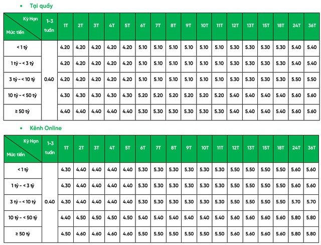 Kỳ hạn 24–36 tháng: 5,60% – 5,80%/năm, trong đó mức cao nhất 5,80%/năm áp dụng cho khách hàng gửi từ 50 tỷ đồng trở lên.