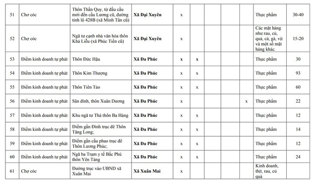 Theo danh sách, phường Hà Đông là một trong những khu vực tập trung nhiều nhất với 8 điểm, bao gồm cả chợ tự phát và chợ cóc nằm rải rác ở các vị trí như khu nghĩa trang Hà Trì, vỉa hè Khu đô thị Văn Khê, hay khu đất đấu giá Ngô Thì Nhậm, vỉa hè đường Nguyễn Thái Học... Ngoài ra, xã Đa Phúc cũng tập trung tới 8 điểm trong danh sách hoàn thành giải tỏa trước ngày 30/1/2026.