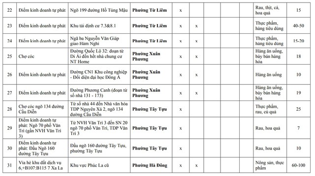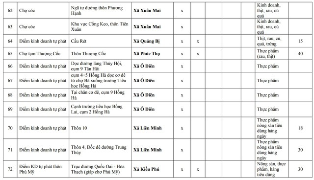 Kế hoạch cũng tổng hợp rõ thông tin các “chợ cóc”, điểm kinh doanh tự phát thuộc 4 nhóm trên. Theo phụ lục đính kèm, danh sách ghi nhận 75 điểm thuộc nhóm 1, tức nhóm hoàn thành giải tỏa trước ngày 30/1/2026, cụ thể như sau:
