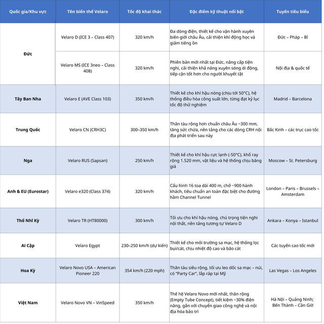 Tổng thể, sự đa dạng của các biến thể Velaro phản ánh một xu hướng chung: tàu cao tốc ngày nay không còn là sản phẩm "một kích cỡ cho tất cả", mà là nền tảng công nghệ linh hoạt, được tùy chỉnh theo từng thị trường, trong bối cảnh nhiều quốc gia coi đường sắt cao tốc là giải pháp giao thông chiến lược cho phát triển bền vững.