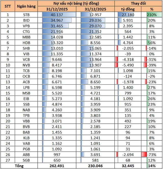 Thống kê từ báo cáo tài chính 27 ngân hàng trên sàn chứng khoán cho thấy, tổng nợ xấu nội bảng tại thời điểm 31/12/2025 đạt 262.491 tỷ đồng, tăng thêm 32.445 tỷ đồng so với cuối năm trước, tương đương mức tăng 14%.
