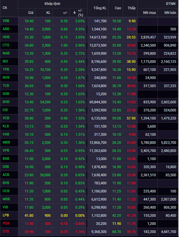 Về giao dịch khối ngoại, dòng vốn ngoại tiếp tục phân hóa, mua ròng tại một số mã như HDB, ACB, MBB, trong khi bán ròng tại VCB, BID, VPB, SHB. Tuy vậy, lực cầu trong nước vẫn chiếm ưu thế, giúp phần lớn cổ phiếu ngân hàng duy trì sắc xanh.