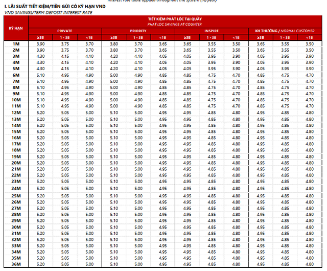 Nhóm Inspire và Khách hàng thường – tệp khách hàng trung cấp – được áp dụng mức lãi suất tương đối hấp dẫn. Trong đó, kỳ hạn 1–2 tháng ở mức lãi suất cao nhất là 3,65%/năm; 3–5 tháng đạt 4,05%/năm; kỳ hạn 6–11 tháng là 4,85%/năm; và kỳ hạn 12–36 tháng cố định ở 4,95%/năm. So với Priority, mức lãi giảm khoảng 0,15 điểm %, và giảm 0,25–0,35 điểm % so với Private tùy kỳ hạn.
