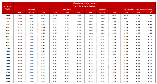 Nhóm Priority trên kênh online có mức lãi suất 4,00%/năm cho kỳ hạn 1–2 tháng; 4,70%/năm cho kỳ hạn 3–5 tháng; 5,20%/năm cho kỳ hạn 6–11 tháng; và 5,30%/năm cho nhóm kỳ hạn 12–36 tháng. So với Private, mức lãi thấp hơn 0,10 điểm %, nhưng vẫn vượt trội hơn Inspire và Khách hàng thường ở mọi kỳ hạn.