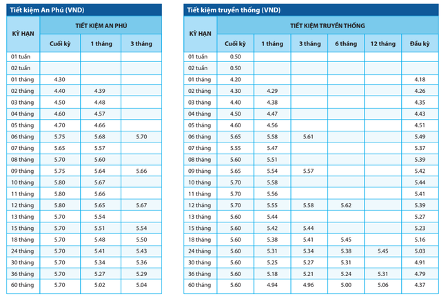 Các mức điều chỉnh tương tự cũng được áp dụng đối với sản phẩm Tiết kiệm truyền thống, song lãi suất niêm yết luôn thấp hơn khoảng 0,1 điểm % so với Tiết kiệm An Phú.