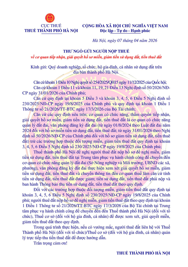 Thuế TP Hà Nội vừa có thư ngỏ gửi các doanh nghiệp, tổ chức, hộ gia đình và cá nhân sử dụng đất trên địa bàn thành phố nhằm hướng dẫn về cơ quan tiếp nhận và giải quyết hồ sơ đề nghị miễn, giảm tiền sử dụng đất và tiền thuê đất.