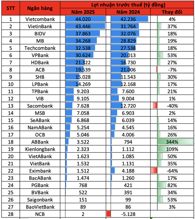 Năm 2025 chứng kiến lợi nhuận ngành ngân hàng được đẩy lên mức cao mới, khi tổng lãi trước thuế của 28 ngân hàng đạt gần 356.600 tỷ đồng, tăng 19% so với năm 2024. Trong đó, phần lớn nhà băng tăng trưởng hai chữ số và chỉ số ít ghi nhận sụt giảm.