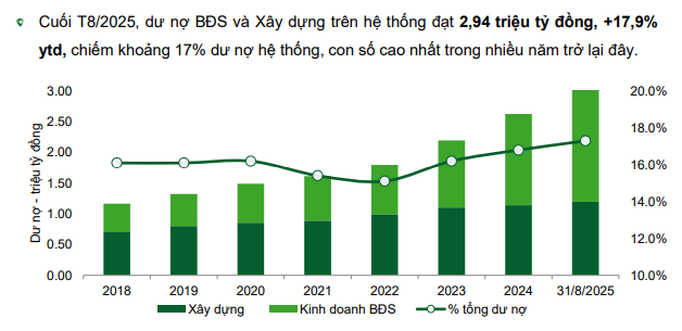 Mặt khác, tín dụng kinh doanh bất động sản cũng tiếp tục tăng trưởng mạnh. Tính đến cuối quý 3/2025, dư nợ tín dụng cho kinh doanh BĐS đạt hơn 1,82 triệu tỷ đồng, tăng 35% so với cuối năm 2024, chiếm 10,1% dư nợ nền kinh tế. Trong đó, tín dụng tăng mạnh ở nhóm doanh nghiệp phát triển BĐS (tăng 39,88% so với cuối năm 2024), đã vượt qua nhóm khách hàng cá nhân (vay xây dựng, sửa chữa để bán,…). Đến cuối tháng 8/2025, dư nợ BĐS và Xây dựng trên hệ thống đạt 2,94 triệu tỷ đồng, tăng 17,9% so với cuối năm 2024, chiếm khoảng 17% dư nợ hệ thống, con số cao nhất trong nhiều năm trở lại đây.