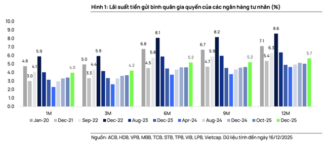 Theo Vietcap, đợt tăng lãi suất gần đây chủ yếu được dẫn dắt bởi các ngân hàng tư nhân, đặc biệt là các ngân hàng nhỏ, tập trung vào khách hàng bán lẻ. Tính bình quân theo quy mô tiền gửi, các ngân hàng tư nhân đã tăng lãi suất huy động khoảng 0,5 - 0,64 điểm % tùy kỳ hạn trong ba tháng vừa qua.