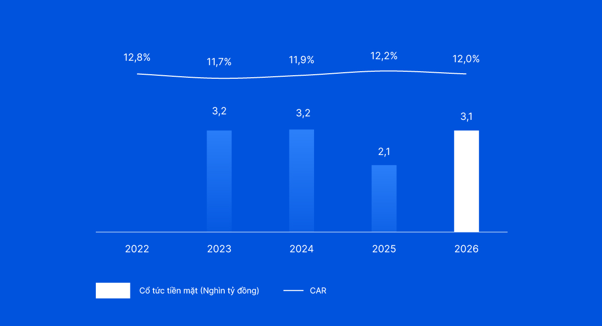 Chính sách cổ tức hấp dẫn được duy trì nhờ hiệu quả hoạt động bền vững của VIB trong nhiều năm liên tiếp, với ROE thường xuyên ở nhóm dẫn đầu ngành và nền tảng vốn lành mạnh. Hệ số an toàn vốn duy trì ở mức cao, tạo dư địa vững chắc để VIB đồng thời thực hiện chi trả cổ tức và duy trì quỹ đệm vốn cho tăng trưởng trong năm 2026.