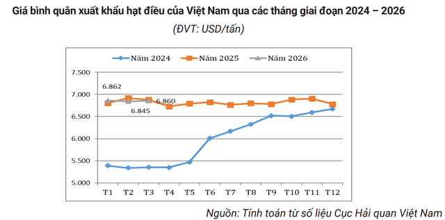 Theo số liệu từ cơ quan chức năng, trong 3 tháng đầu năm, Việt Nam xuất khẩu khoảng 125 nghìn tấn hạt điều, thu về hơn 860 triệu USD, tăng nhẹ cả về lượng và giá trị so với cùng kỳ năm 2025. Giá xuất khẩu bình quân duy trì quanh mức 6.800 USD/tấn, gần như đi ngang so với năm trước.