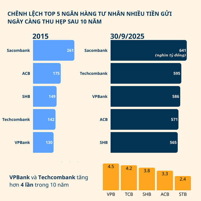 Tính chung trong 9 tháng đầu năm 2025, tăng trưởng huy động tiền gửi khách hàng của Top ngân hàng tư nhân lần lượt: VPBank (20,6%), SHB (13%), Techcombank (11,6%), ACB (6,3%).