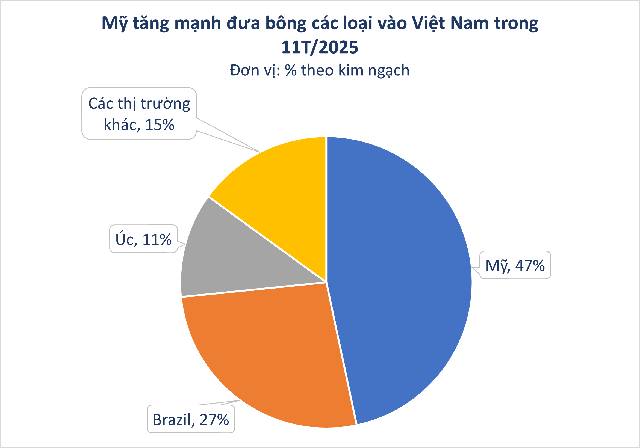 Trong 11 tháng đầu năm, Mỹ là thị trường nhập khẩu bông lớn nhất cho Việt Nam, chiếm gần 47%, đạt 723 nghìn tấn, đạt 1,27 tỷ USD, tăng mạnh gần 130% về lượng và tăng 94% về trị giá so với cùng kỳ năm 2024. Riêng tháng 10, mức tăng lên tới 141% về lượng và 135% về trị giá.